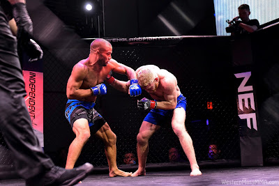 Matt starts it with 3 leg kicks to the body. Matt slips with a kick and Bill dives into the guard. Bill is softening him up with some punches to the body. Bill tries to take the back but slips off. Matt is bleeding on the back of his head. They stand back up and Bill slams Matt to the mat. They stand back up and Bill slams him to the mat again. Bill passes to full mount and has Denning's back. Matt defends and pushes Bill back to half guard. Bill has the side and gets in 3 hard elbows. Bill has Matt's back and is getting in punches as the round ends.
