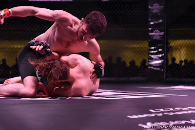 Warchild and I arrived at the venue with plenty of time before the fights. We quickly meandered our way and found our seats. The crowd is starting to pour in now as well. Combat Zone has a little different setup with two big screens so there is no way anyone will miss the action. The dj, light crew (shoutout to Chris Kersch) and the video crew are all set back up in the corner and the media are setup on a platform so we can see right over the crowd. So far for local celebrities that I have seen are of course Calvin Kattar, Joey Gomez, Tyson Chartier, Connor Barry and John Raio. The announcer for the evening is John Vena and the refs are Kevin Macdonald Alan Lau and Chris Burke. The sound system is nice, loud and clear so I am sure everyone in the room can hear it. The national anthem has been sung and the fights are about to begin. Please follow along as I try to keep up with all the action below...